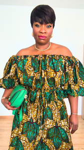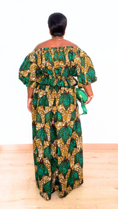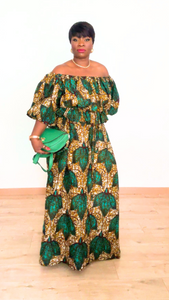 Adoptez un look à la fois élégant, audacieux et intemporel avec cet ensemble en pagne wax 100% coton. Ce duo composé d’un haut style Bardot à épaules dénudées et d’une jupe longue taille haute met en valeur la silhouette avec raffinement. Les motifs feuillages verts sur fond ocre donnent une allure fraîche et majestueuse parfaite pour toutes les occasions : cérémonies, sorties estivales ou événements culturels.